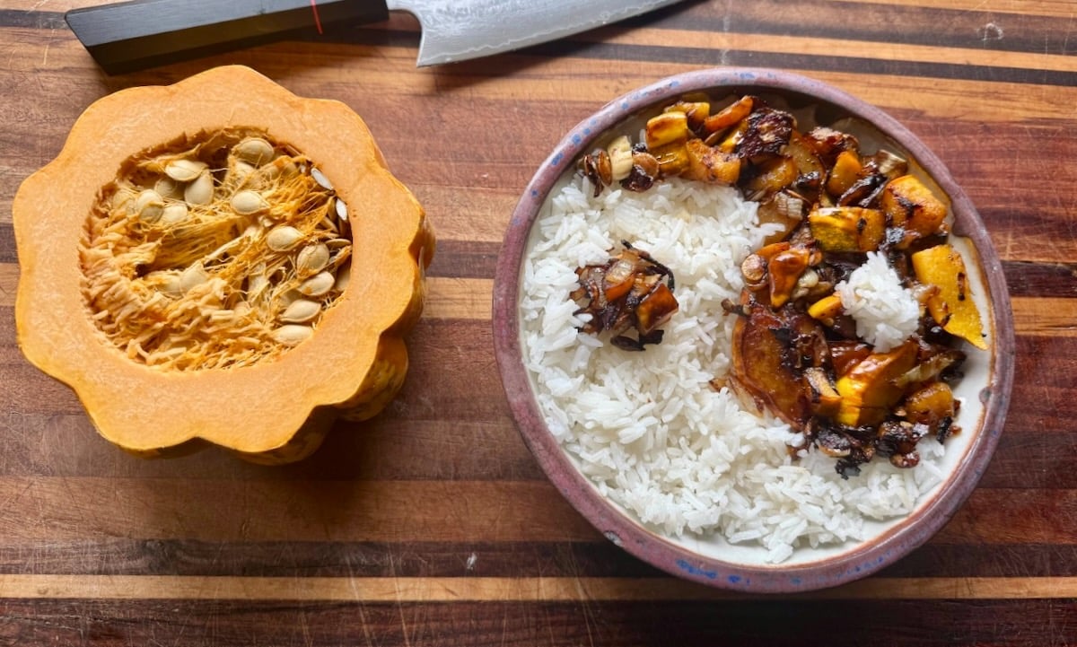 Since the squash harvested last fall is still readily available, I decided to serve my rice with a carnival squash, which is basically a delicata squash that’s shaped like an acorn squash. I like delicata and carnival squashes because they are so easy to pan-fry. The thin skin is edible, so you don’t need to peel it. The small seeds get crispy in the pan, adding texture to the dish.