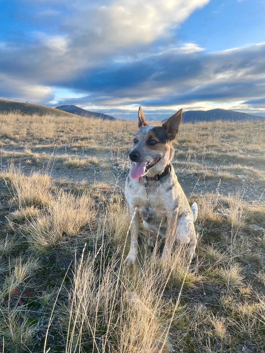 As domestic as she is—she sleeps on our bed—Agatha is also wild, a side of her that comes to life outside, on a trail. To create the blue heeler breed, Australian ranchers bred sheep dogs with wild dingoes. When she’s on the mountain it’s as if a part of Agatha remembers being a dingo again; she is invigorated by the smells, the wind and the meadowlarks. Being a herding animal, she is good at staying close and she’ll patiently shepherd me up the mountain without the need of a leash. It feels like cathartic healing for her long hours on the couch.