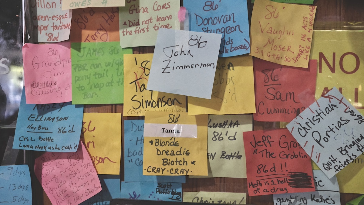 But then you’re sitting there, enjoying whatever dereliction of duty has brought you to this point, and your eye is drawn to the wall behind the bar. There you see dozens of Post-It notes and on these are written names or sometimes just descriptions and occasionally some combination of the two. And just when you’re starting to wonder if maybe they’re up there for having done something good you notice a few of these notes describe specific acts such as theft, harassment, or general assholery.