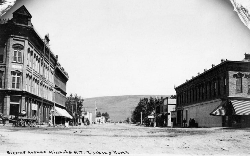 Within a couple decades, that little industrial kernel had sprouted a real town. An 1888 photograph taken from the middle of the intersection showed a four-story Florence Hotel on the west side and the Missoula Mercantile Company on the east, with a wide street stretching north toward Waterworks Hill. The south bank was more hodge-podge, with a mix of private homes and warehouses dominated by Garden City Commercial College’s three-story institution by the turn of the 20th century.