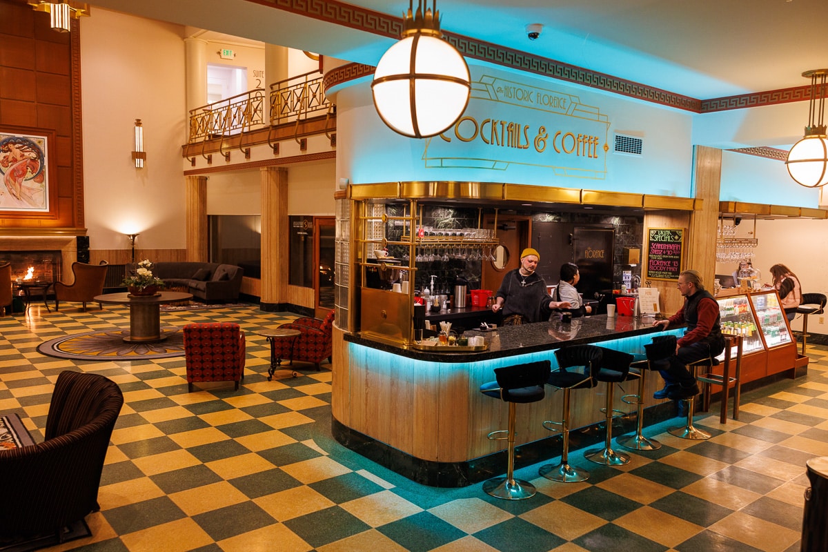 Speaking of flames, the Florence Building has a complicated history with fire. The original Florence Hotel opened in 1888 but burned in 1913. It was rebuilt, and then … it burned again, in 1936. In 1941, in the middle of the Great Depression, it was rebuilt again as a seven-story, grand hotel in Art Moderne style, and that’s the building we have with us today. And it hasn’t caught fire since! Knock on wood, right? Just to be safe. But it’s worth noting that in classic Art Moderne style, it is made of not-too-flammable concrete and terra cotta tiles. There’s a lot more history to the Florence, but we’ll save that for another time. These days, it’s not a hotel but a historic building with ground-floor shops and upper-level offices, plus a ballroom. And just past the coffee and cocktails bar is an open lobby with couches and a glowing fireplace. In my opinion, it’s hands down the most elegant atmosphere in town.
