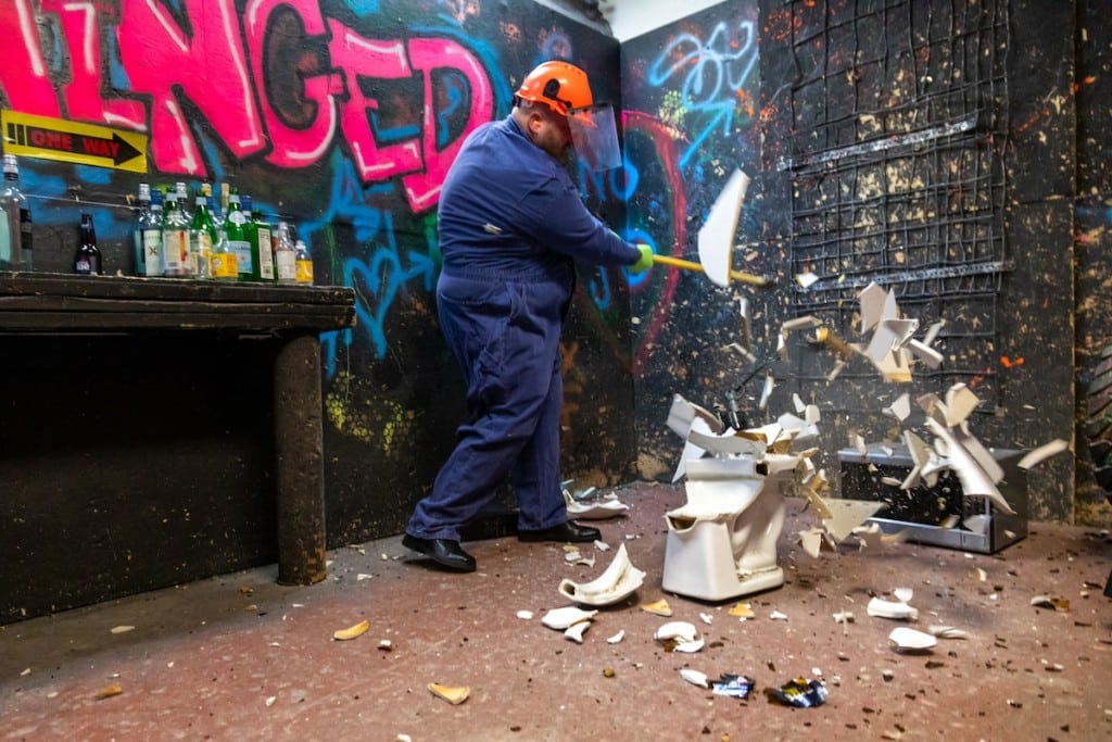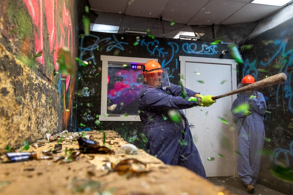 The rage room, called Unhinged, provides each patron with a hard hat equipped with a full face shield, ear plugs, gloves and an unflattering upcycled blue jumpsuit straight out of a mechanic’s shop.