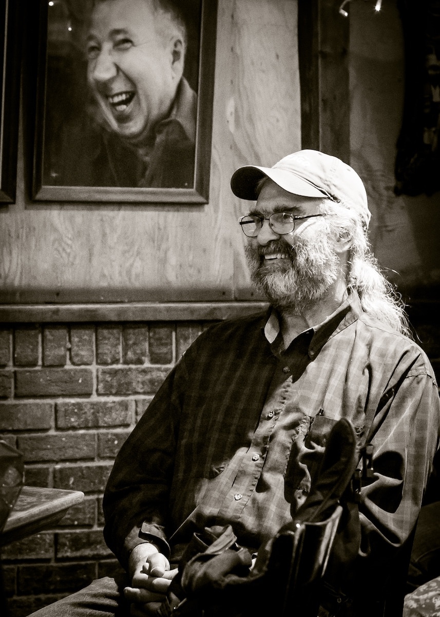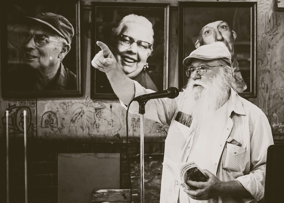 The Walking Poet moves slowly across that floor today, but he still moves. He’s been coming here longer than most of these people have been drawing breath. He was here back when it was Eddie’s Club and the people in those portraits were sitting on the next stool over, asking him when he was going to get serious and find a job.