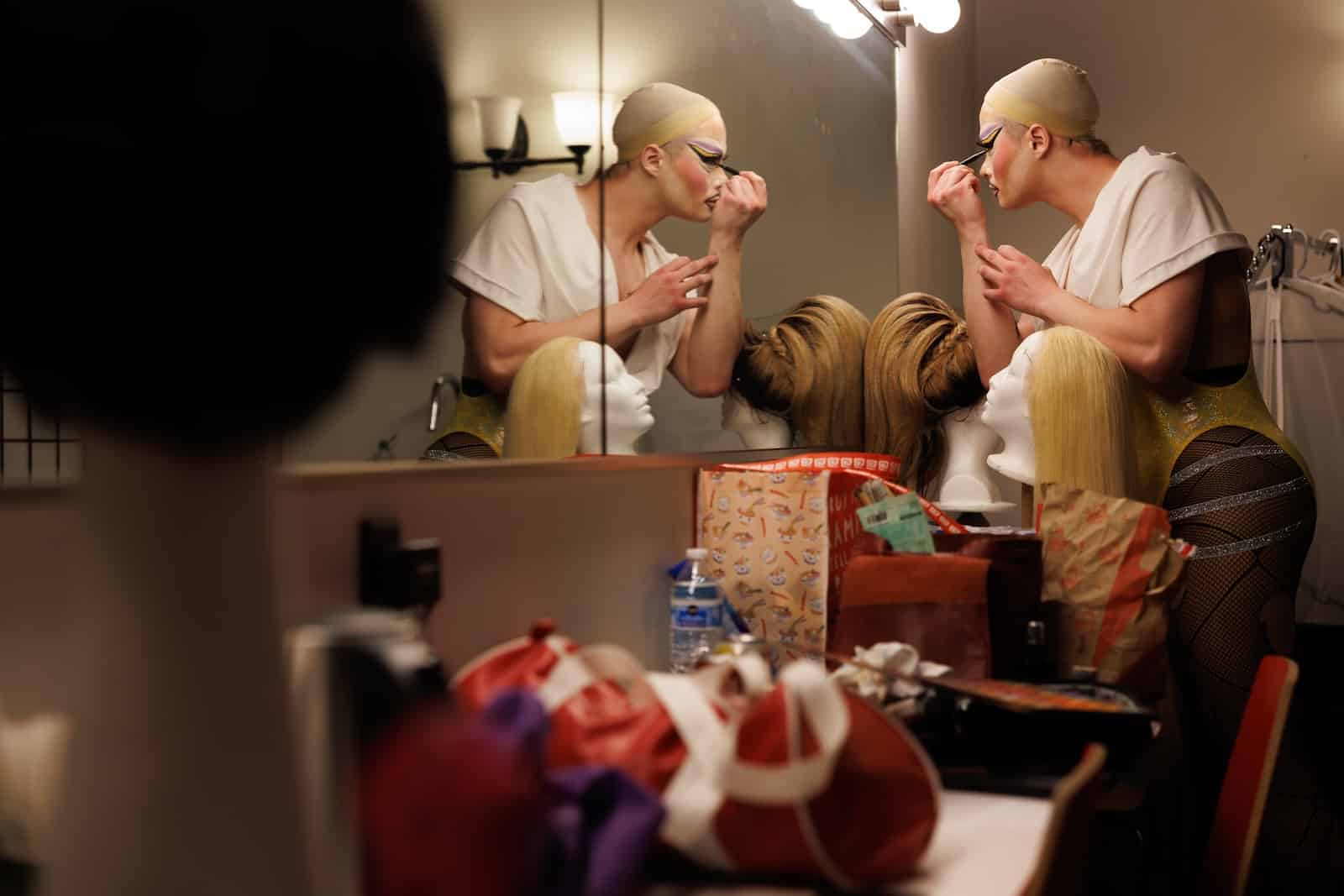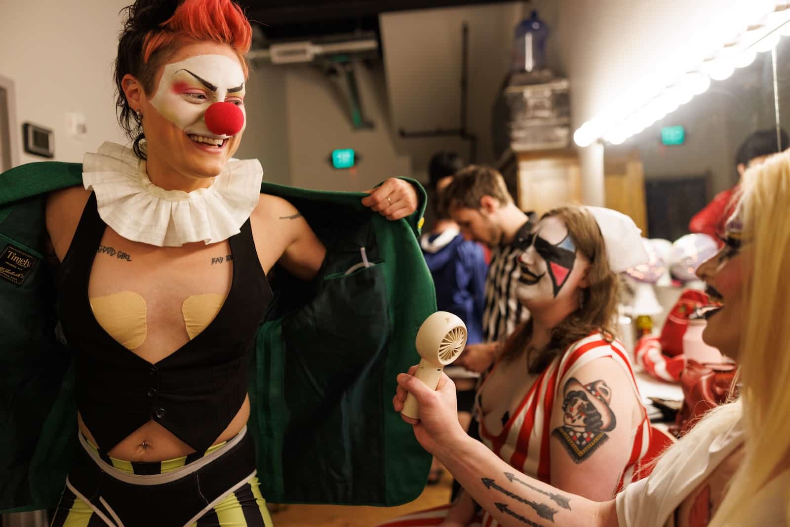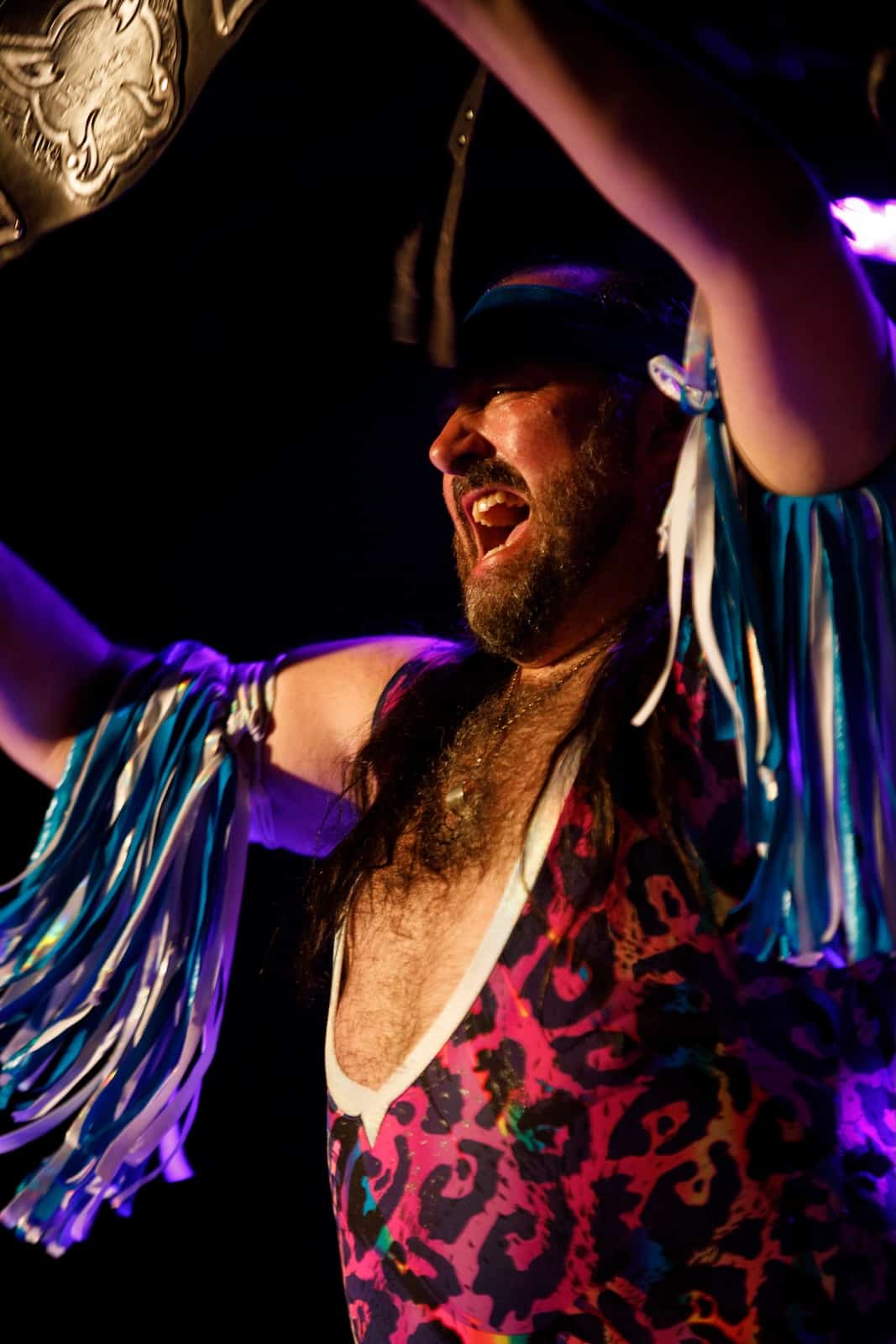 The room is loud. Not just in volume, but in spirit — a fringed and feathered, sequined and striped scene. A referee weaves between chairs, collecting dollar bills in a top hat that quickly starts to overflow. Nearby, another performer, clad head-to-toe in a pink leopard print bodysuit leans against a backlit doorway at the side of the dark room, blue and white streamers hanging from bands on their arms.