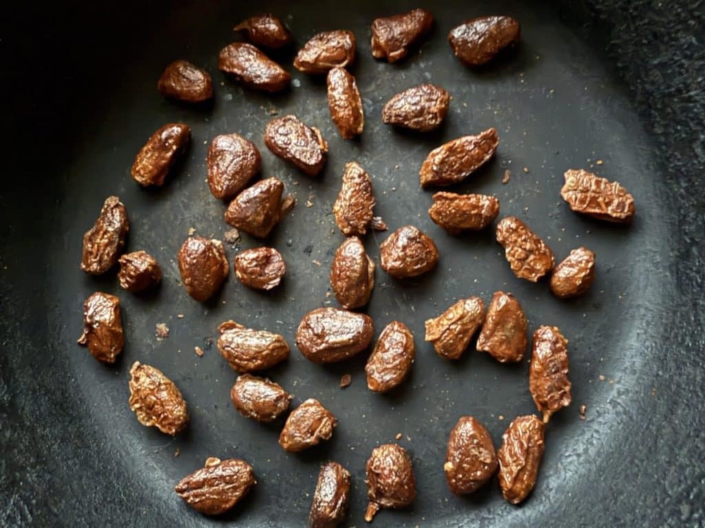 As Remy had cleaned out Ken’s ripe cacao pods, I visited a nearby self-serve farm stand and grabbed a few, with which I made a batch of Ken-style seeds, but with a twist. Before dehydrating them I tossed the white pulpy seeds with sugar and vanilla, because nothing brings out the flavor of chocolate like those two. After dehydrating these seasoned cacao seeds I roasted them to add that rich, dark chocolatey flavor. At this point they were perfect. No further processing necessary. A sweet and vaguely fruity, deeply chocolatey snack, as crunchy as a corn flake. I am munching on some of these as we speak, as I sip my coffee. A more pleasurable and potent combination of beans does not exist.