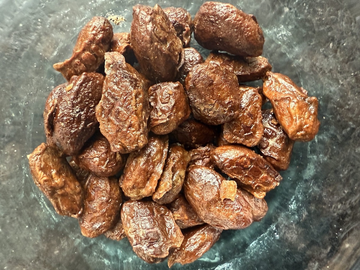 Although Ken has a grove of cacao trees, he doesn’t bother with the laborious chocolate-making process with his small harvest. Instead, he has a hack to easily turn the beans into a tasty snack. He simply places the individual cacao seeds on dehydrator trays, pulp and all. He dries the beans to a crisp, and done. The pulp shrinks down and hardens into a sweet leather that encapsulates the seeds, adding just the right amount of sweetness to balance the bitterness of the cocoa bean, to my taste anyway. If I had cacao trees, I would probably opt for doing the same with my beans too.