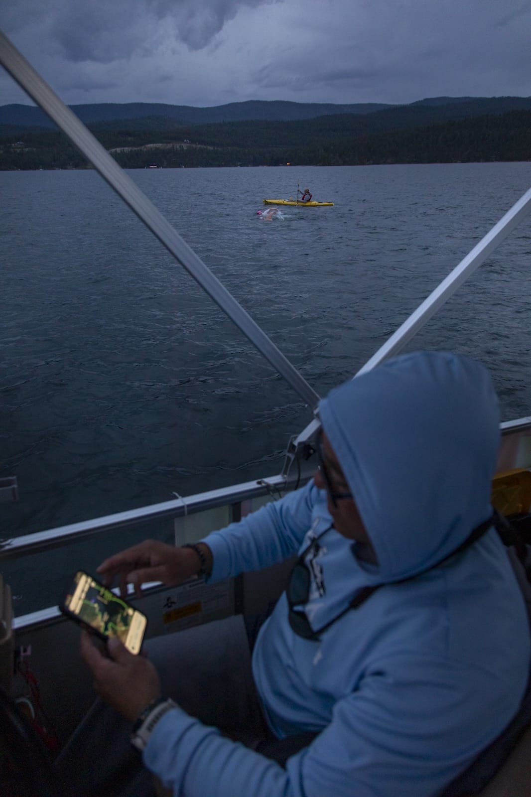By the time we gathered in the dark near midnight at the Somers boat launch on July 18, her plan was dialed. Her feeds included carb drinks, electrolytes, and, interestingly, Smucker’s Uncrustables. The route traced the western shore: past Lakeside, around Angel Point where three lights acted as our primary navigation beacons, threading between Goose Island and the mainland, down past Cedar Island, onward to Black Point, and eventually through the open water of Polson Bay.