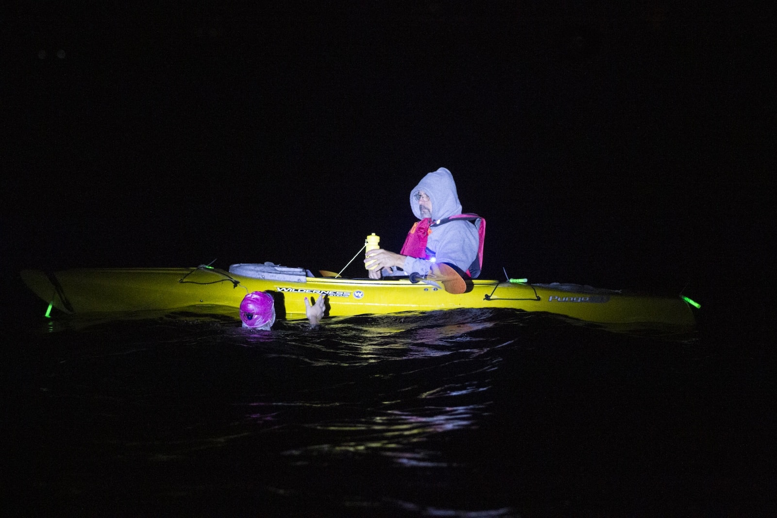 And then, 12 hours in — she hit a wall. Up to this point in the swim, Bella had been mechanical. Focused. She wasted no time on small talk, not even during her closely monitored schedule of refueling and hydrating, or “feeds” as her crew referred to them. But now, in the middle of this vast body of water with the wind whipping and the waves rolling beneath her, we could see her beginning to crack. She let herself drift for a moment and then in a highly uncharacteristic and vulnerable moment, she called out to Bender.
