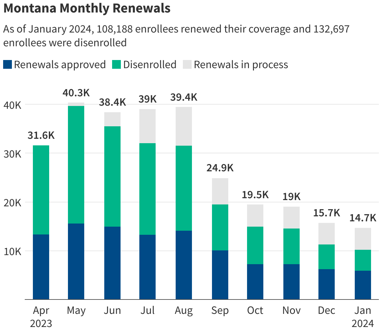 There’s another factor to consider. KFF data indicates that after Biden lifted the moratorium on redetermination, 43 states chose to complete redetermination over a 12- to 14-month period. Montana chose to complete the review process on a more aggressive timeline—only 10 months. KFF notes that a number of states have responded to high initial disenrollment rates by pausing disenrollments while they address problems in the process.